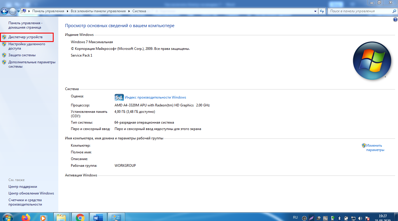 Вкладка «Диспетчер устройств» в настройках системы