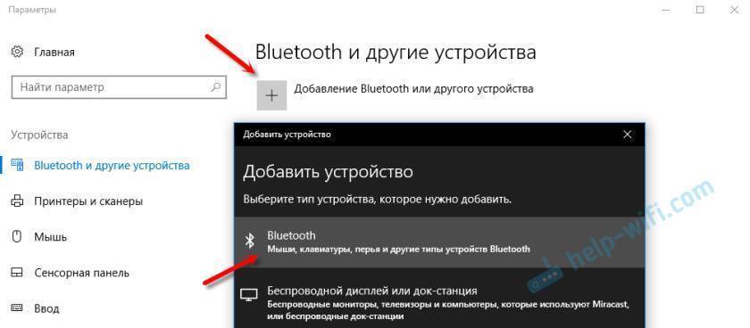 Нажмите на “Добавление Bluetooth или другого устройства” и выберите соответствующий пункт в следующем окне.