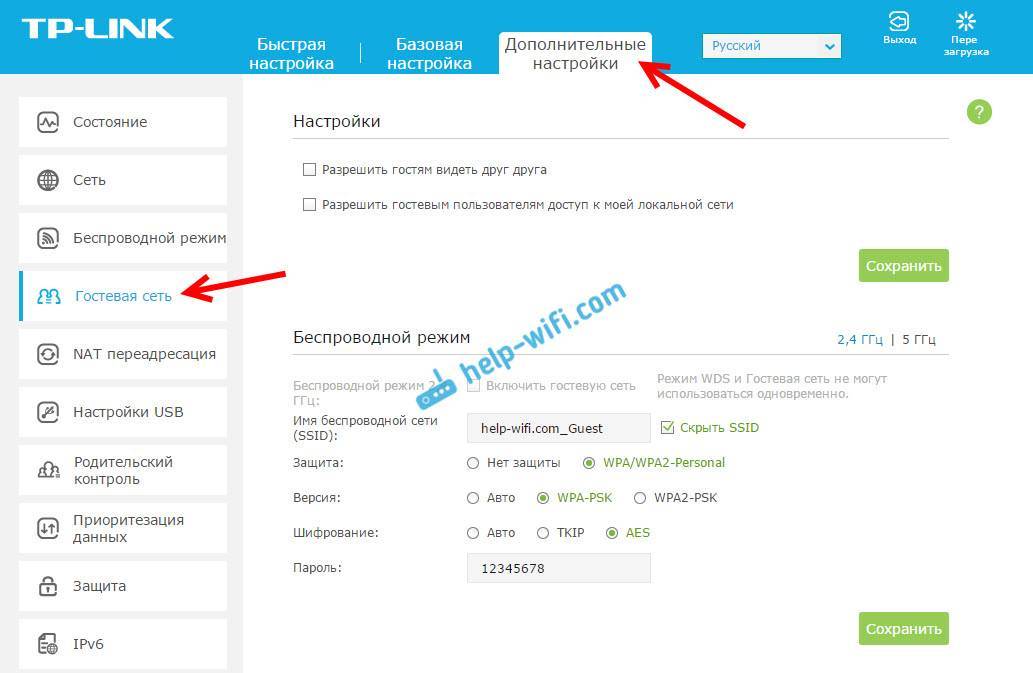 Есть уже модели роутеров Tp-Link, на которых установлена новая, красивая панель управления. В голубых тонах. Там уже можно выбрать русский язык и настроить гостевую сеть на вкладке Дополнительные настройки – Гостевая сеть. Выглядит это вот так: