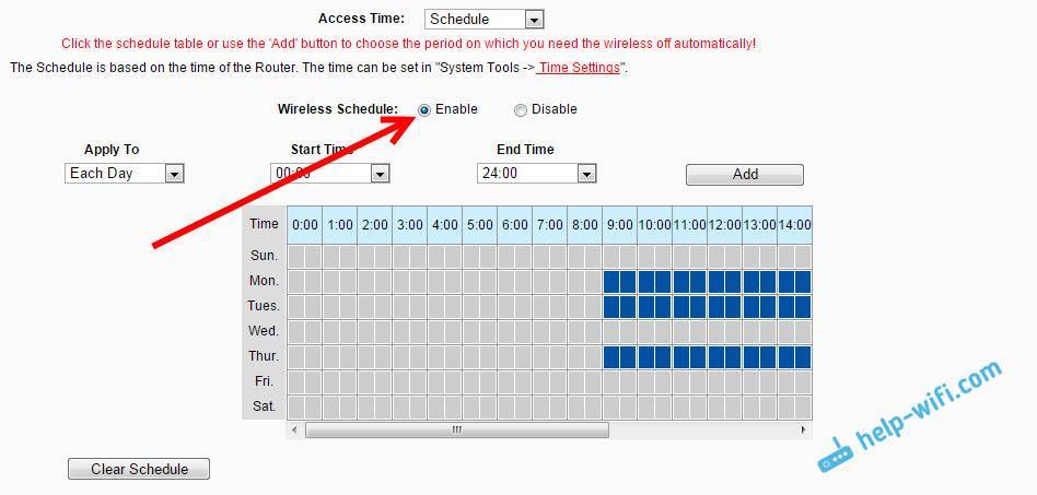 Когда вы напротив пункта Access Time выберите Schedule, то сеть будет работать всегда. А снизу появится график. Так вот, что бы настроить работу по графику, нужно еще возле Wireless Schedule поставить метку возле Enable. Включить работу по графику, а затем просто настроить его.