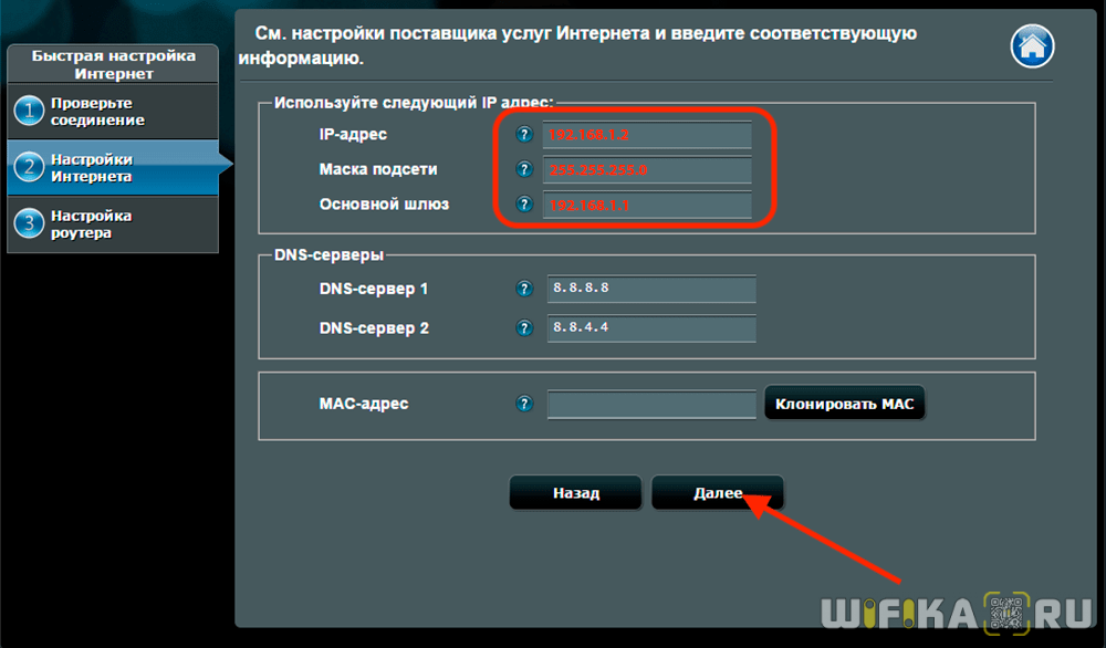 - Если провайдером используется динамический IP, указывать дополнительные данные не потребуется. При статистической IP, PPPoE и т. д. нужно будет ввести имя сети и защитный код. Кроме того, при ручной настройке самостоятельно вносятся данные: маска подсети, шлюз, DNS-сервер.