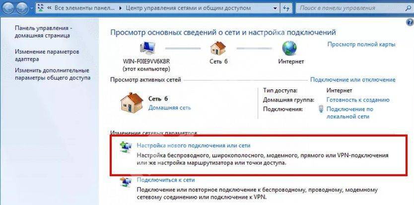 В окне с информацией о сетевых подключениях жмите на кнопку Настройка нового подключения или сети.