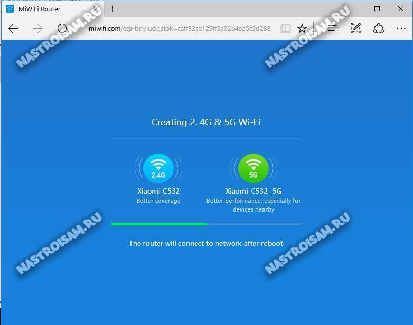 - Появится окно, где будет написано, что роутер будет имеет 2 Wi-Fi сети с разными названиями и частотами. Второй сети для диапазона 5 ГГц также нужно дать имя и придумать код безопасности. Затем устройство уйдет в перезагрузку.