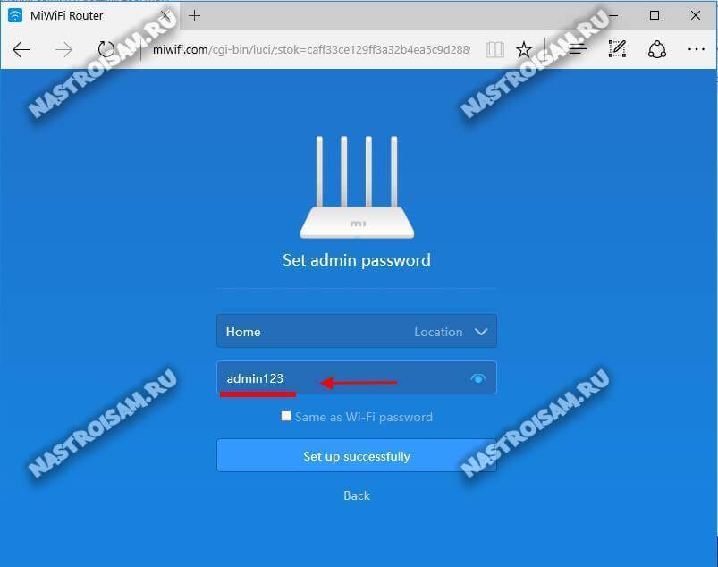 Теперь необходимо придумать и ввести пароль на вход в панель Веб-интерфейса. После этого нажимаем на кнопку «Set up successfully» и ждем пока роутер Xiaomi Mi3 применит настройки и перезагрузится: