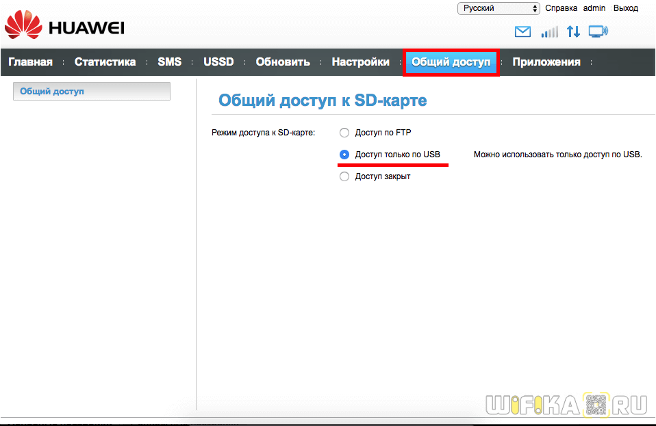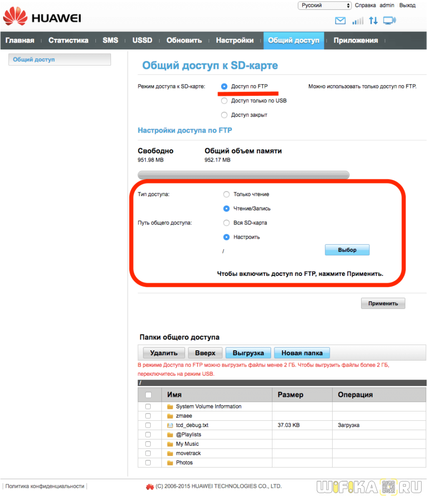 И еще одна интересная особенность модема Huawei E8372h — это поддержка работы с микро SD картами. Она, также как и симка, устанавливается внутрь корпуса. На ее базе можно создать сетевой FTP сервер и открыть в него доступ для всех гаджетов, подключенных к его WiFi сети. Находится эта настройка в разделе «Общий доступ».