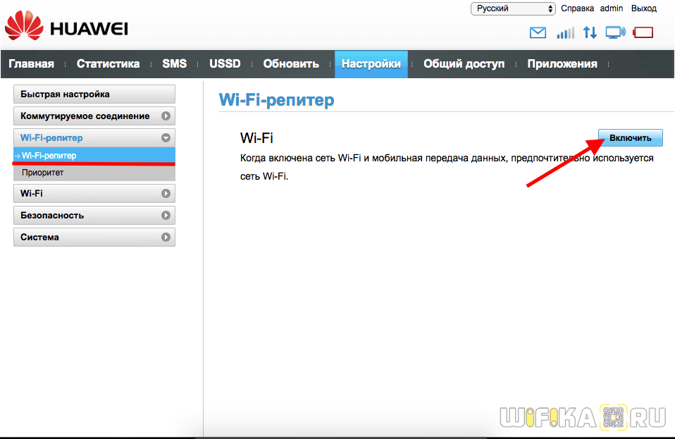 В отдельный раздел меню вынесено управление режимом «wifi репитера». Если его включить, то модем Huawei сможет выбирать, откуда брать интернет — от другого маршрутизатора или с СИМ-карты. Это удобно, если вы подключили модем к ноутбуку. Чтобы не тратить мобильный трафик, при нахождении в зоне известного вай-фай сигнала предпочтение будет отдаваться именно ему.