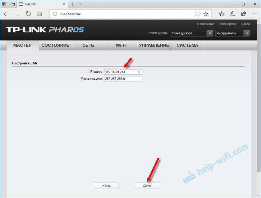 Дальше просто меняем режим работы точки доступа и настраиваем ее.