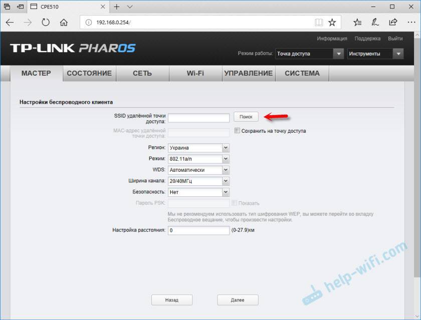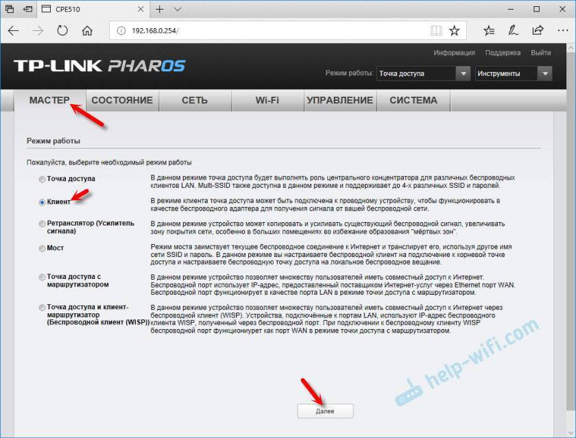Вторую точку доступа (на втором конце) нужно настроить в режиме клиента. Перед настройкой ее нужно направить на источник сигнала (в нашем случае, это первая ТД) . Подключаемся к ней, заходим в настройки и переключаемся в режим «Клиент».