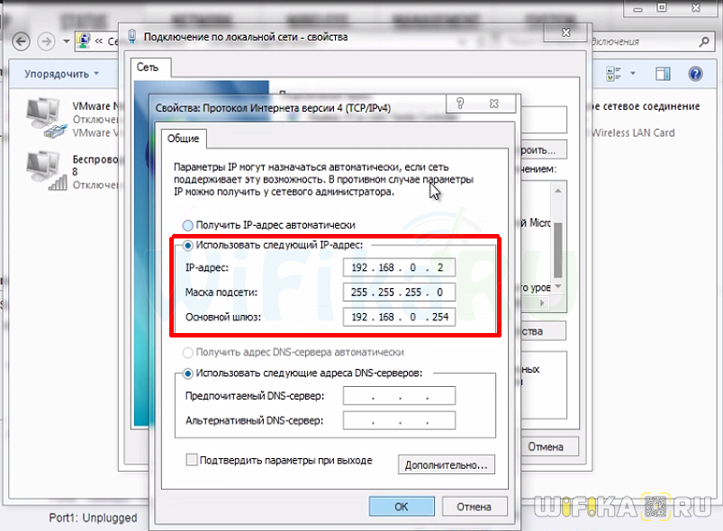 В свойствах сетевого адаптера (Ethernet), для протокола IPv4 нужно прописать статические адреса. IP-адрес прописываем например 192.168.0.2, маска подсети будет выставлена автоматически, а в поле основной шлюз указываем 192.168.0.254.