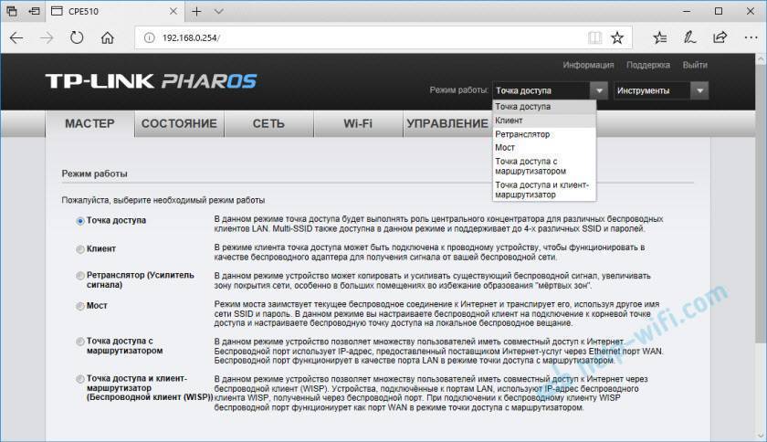 - Точка доступа и клиент маршрутизатор. Почитайте описание выше на скриншоте. Я так и не понял, что это конкретно за режим Походу, это подключение к провайдеру по беспроводной сети (WISP) и раздача интернета на другие устройства.