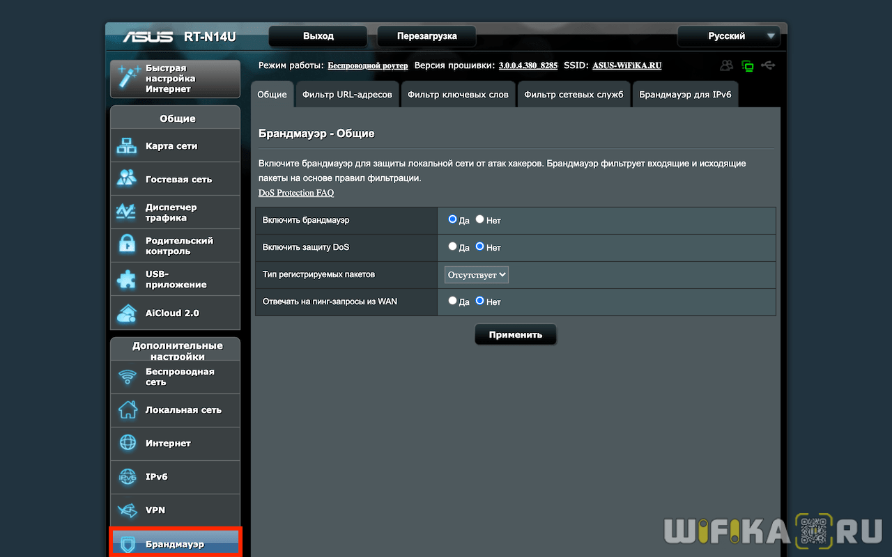 Как в любом современном роутере, в Asus целый раздел посвящен настройкам безопасности системы. Они сосредоточены в меню «Брандмауэр»