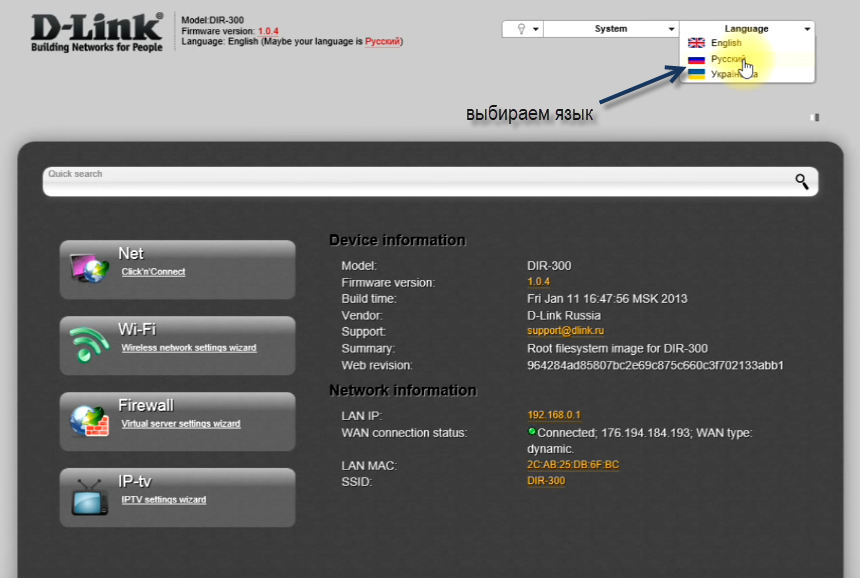 Далее начнется непосредственно настройка роутера D LINK DIR 300, но мы рекомендуем с этим не спешить. В правом верхнем углу экрана на данном шаге вы можете сменить язык интерфейса настроек маршрутизатора, а также у вас есть возможность установить свой собственный пароль