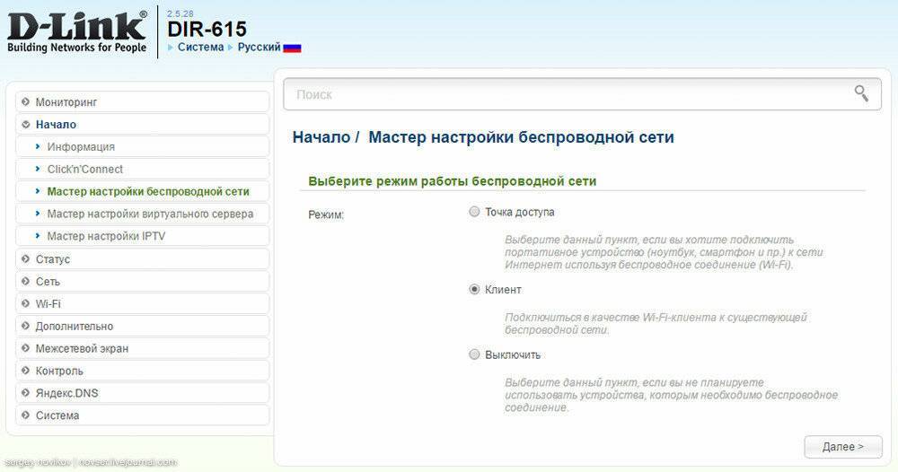 Но, как выяснилось позже уже, такая возможность есть на на всех д-линковских роутерах, даже на DIR–615-м из серии K, почему-то вкладки «Клиент» нет вообще. Возможно это временное и с новой прошивкой появится.В общем пойдем самым простым путем в настройки, хотя изначально я зашел с другой стороны :))