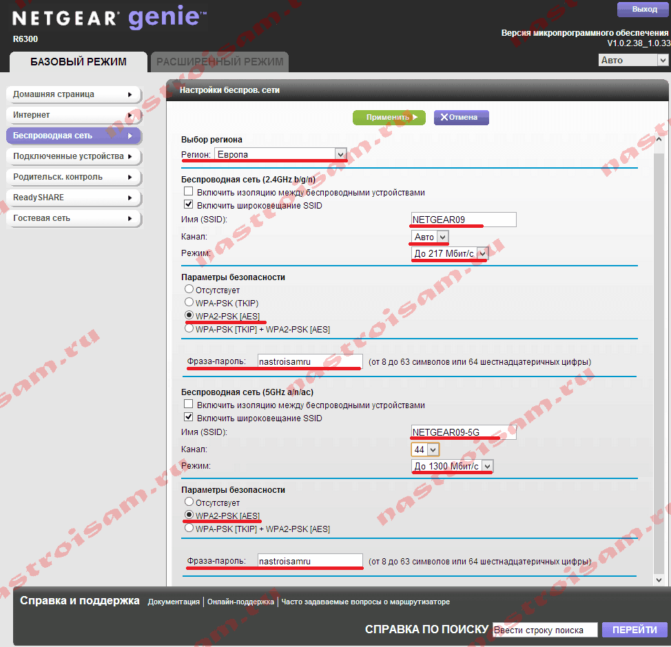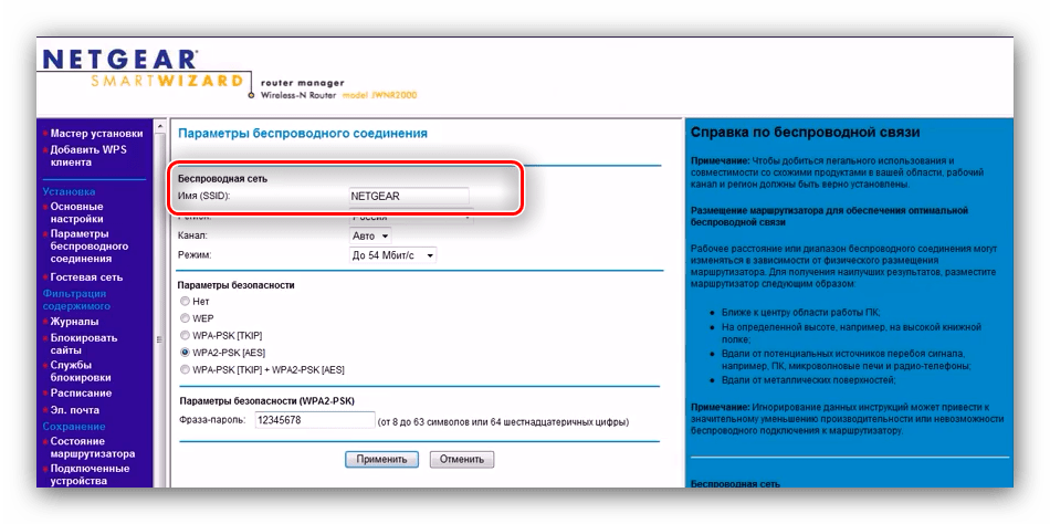 Здесь необходимо ввести идентификатор беспроводной сети — SSID — он может быть любым буквенным или цифирным значением. «Регион» — «Европа»; «Канал» — «Авто»; «Режим» — «До 145 Мбит/с». Шифрование либо смешанный «WPA-PSK + WPA2-PSK» либо, что безопаснее, «WPA2-PSK». Ниже вводим кодовую фразу-пароль и нажимаем кнопку «Применит»ь.