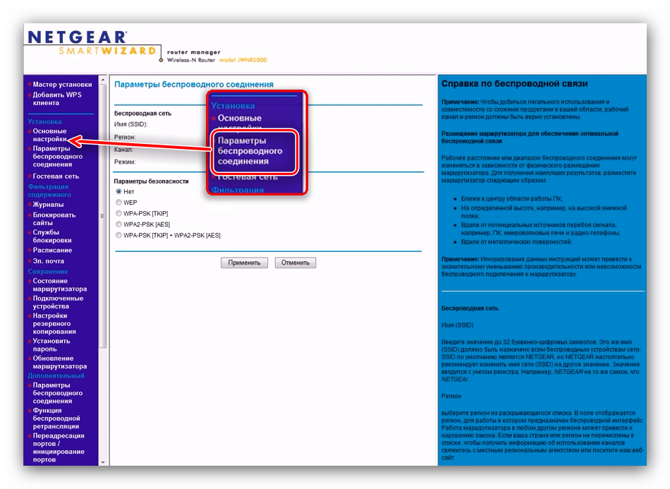 Для полноценной работы беспроводного подключения на рассматриваемом роутере необходимо произвести ряд настроек. Нужные параметры расположены в «Установка»