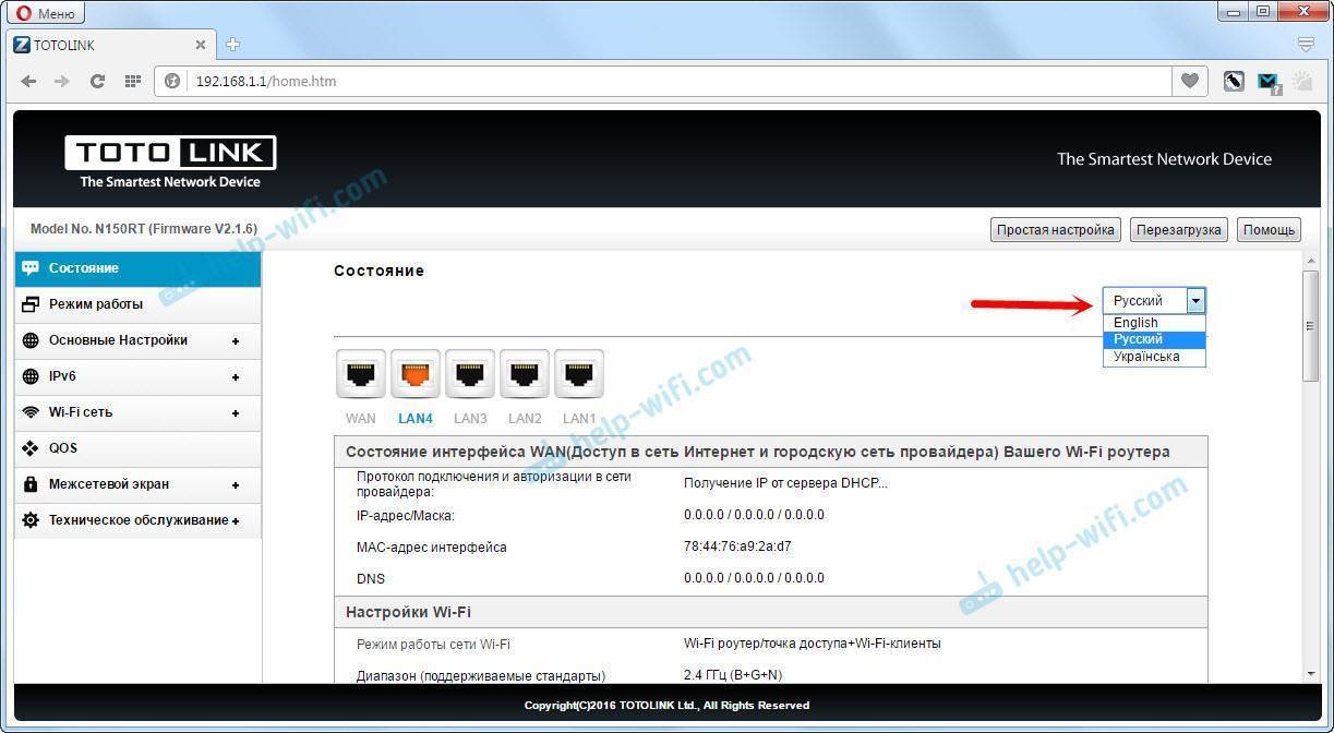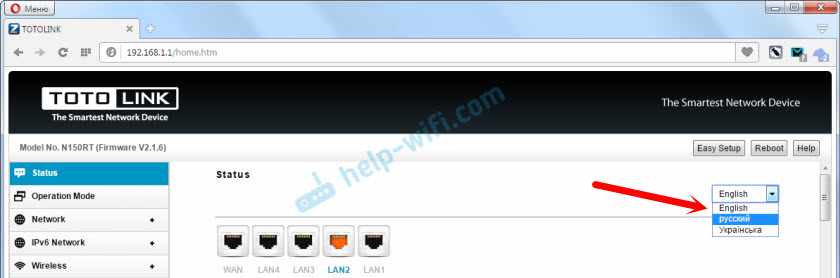 После авторизации откроется страница с быстрыми настройками маршрутизатора Totolink. Давайте еще покажу, как сменить язык на русский, или украинский. Так как у меня по умолчанию был английский.