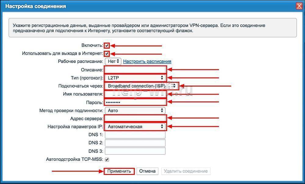 - Отметьте галочками «Включить» и «Использовать для выхода в интернет»;