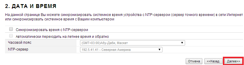 На странице можно синхронизировать системное время устройства с NTP-сервером (сервер точного времени) в сети Интернет или синхронизировать системное время с компьютером. Для того чтобы продолжить процесс настройки нажмите кнопку “Далее>>“.