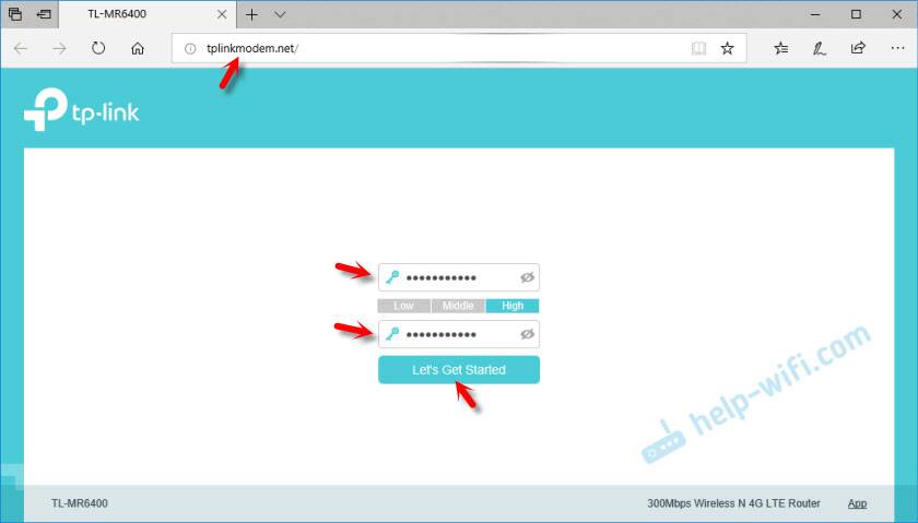 Первым делом нужно установить пароль на роутер (этот пароль нужен для защиты настроек роутера) . Придумайте пароль и укажите его два раза. Обязательно запишите пароль, чтобы не забыть его. Его нужно будет вводить каждый раз, когда будете заходить в настройки TL-MR6400.
