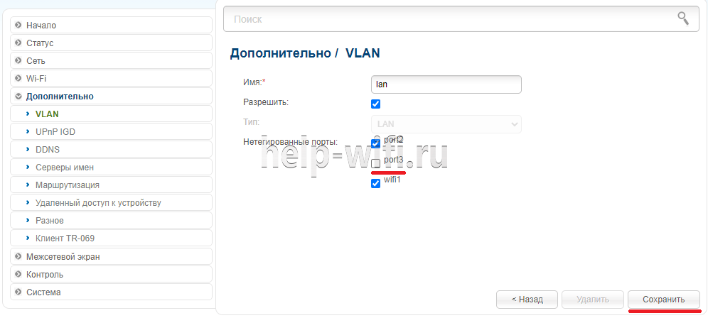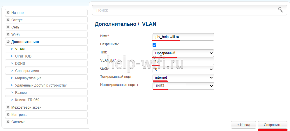 Для настройки доступа в сеть Интернет в разделе «Сеть-WAN» выберите «WAN» и пропишите следующие данные: