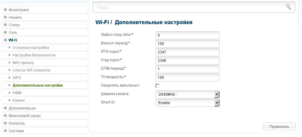 Для настройки беспроводной сети в разделе «Wi-Fi-Основные настройки» установите следующие параметры: