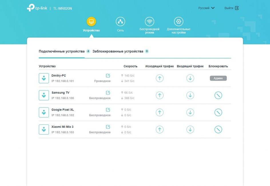 Вскоре попадаем в панель управления, где можно увидеть список подключенных устройств. Для удобства их можно переименовывать, устанавливать конкретные ограничения входящей/исходящей скорости или вовсе блокировать.