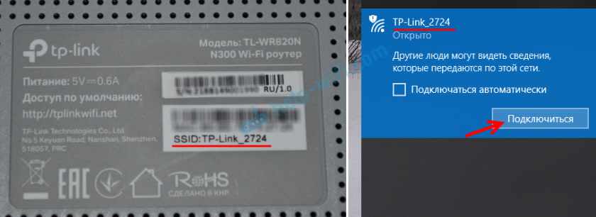 Напомню, что после подключения на компьютере может быть статус ‘Без доступа к интернету’ (ограничено). Если подключится по кабелю нет возможности (например, у вас ноутбук без LAN-порта, он не работает, или вы будете настраивать с телефона/планшета), то можно установить беспроводное соединение. Просто подключитесь к Wi-Fi сети роутера. Заводское имя сети (SSID) можно посмотреть снизу роутера. По умолчанию сеть открыта (подключение без пароля).