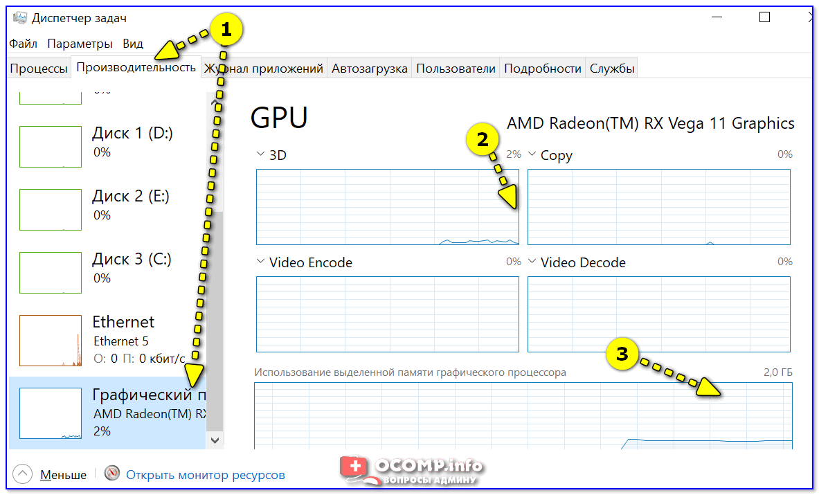 Далее, открыв диспетчер задач (Ctrl+Alt+Del), и перейдя во вкладку «Производительность» — вы сможете наблюдать в режиме реального времени за процентом нагрузки на видеокарту, сколько видеопамяти выделяется и пр.