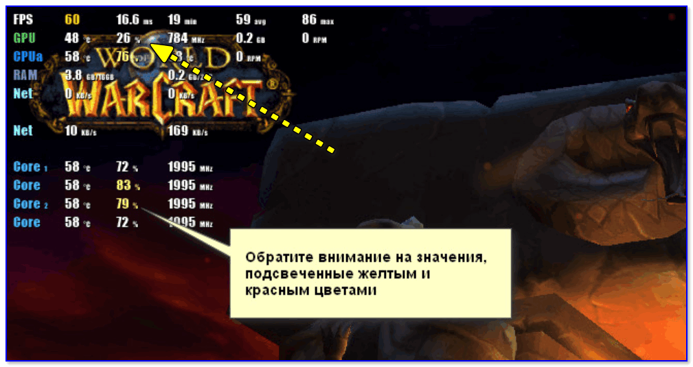 Это весьма удобно и позволяет видеть все цифры, пока вы играете (без сворачивания окон). К тому же, когда какое-либо значение серьезно вырастает — оно начинает подсвечиваться красным и вовремя «бросается» в глаза.