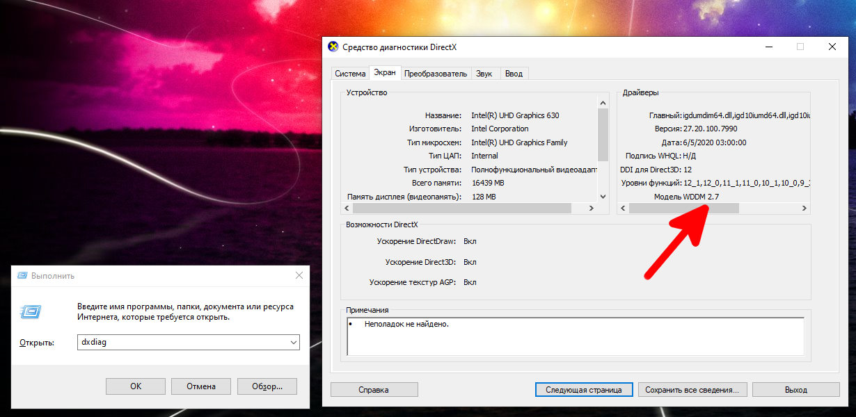 Вы можете проверить, какую версию WDDM использует ваш драйвер графического процессора, нажав Win+R, набрав «dxdiag» в поле, а затем нажав Enter, чтобы открыть инструмент диагностики DirectX.