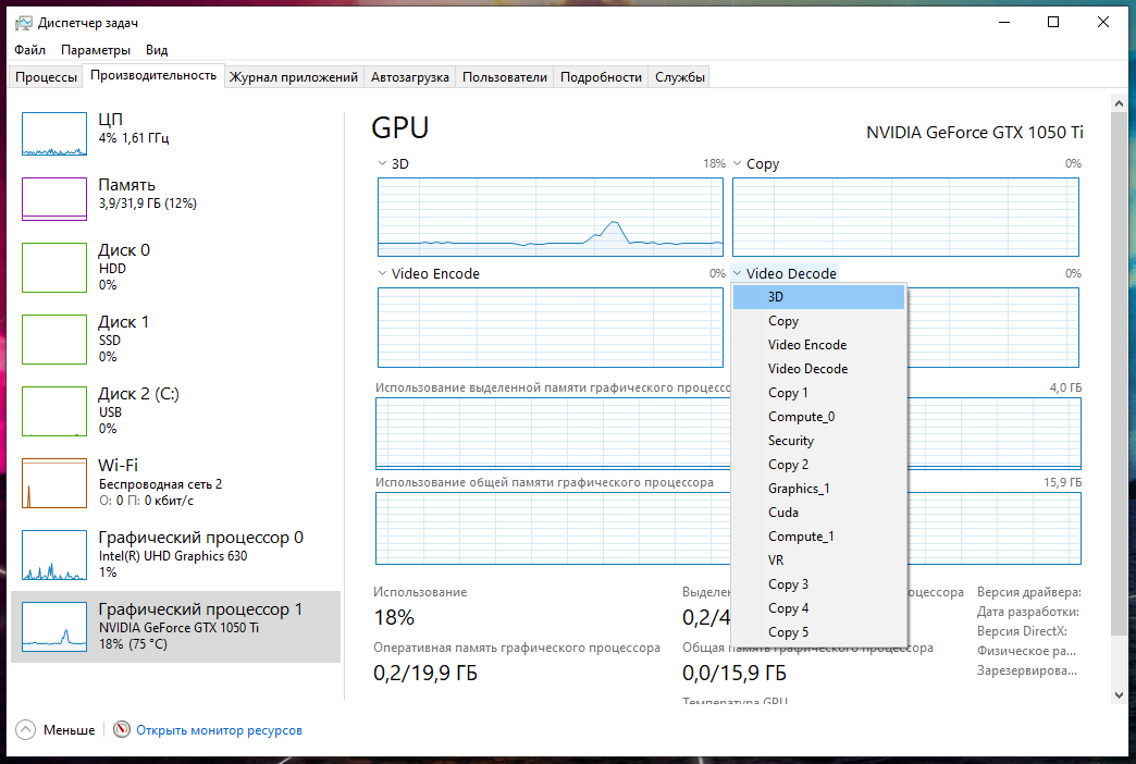 Windows отображает здесь использование графического процессора в реальном времени. По умолчанию диспетчер задач пытается отобразить четыре наиболее интересных механизма в зависимости от того, что происходит в вашей системе. Здесь вы увидите разные графики в зависимости от того, играете ли вы, например, в 3D-игры или кодируете видео. Однако вы можете щёлкнуть любое из названий над графиками и выбрать любой из доступных движков, чтобы выбрать то, что вы хотите видеть.