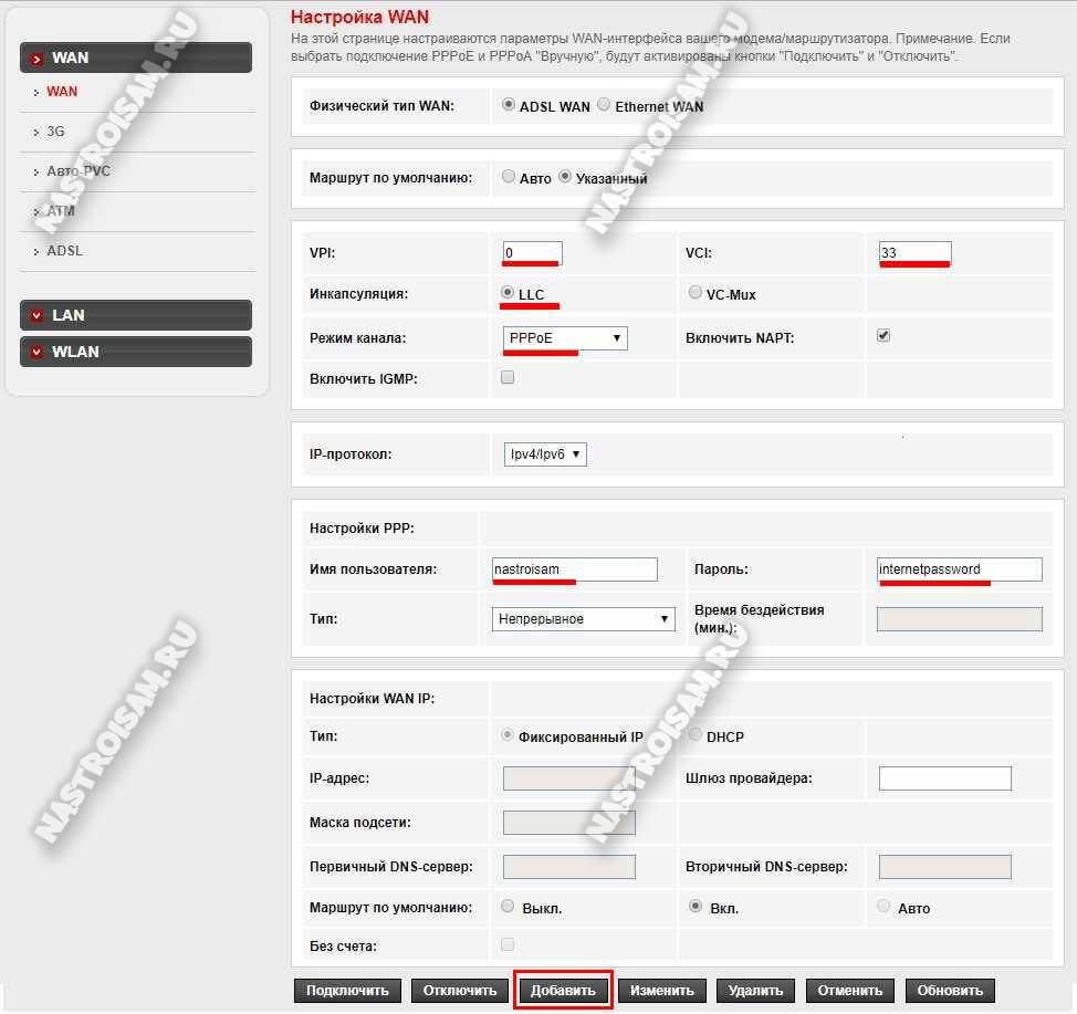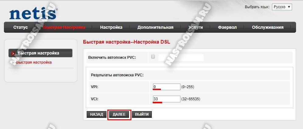 Указываем параметры виртуального канала в поля «VPI» и «VCI»: