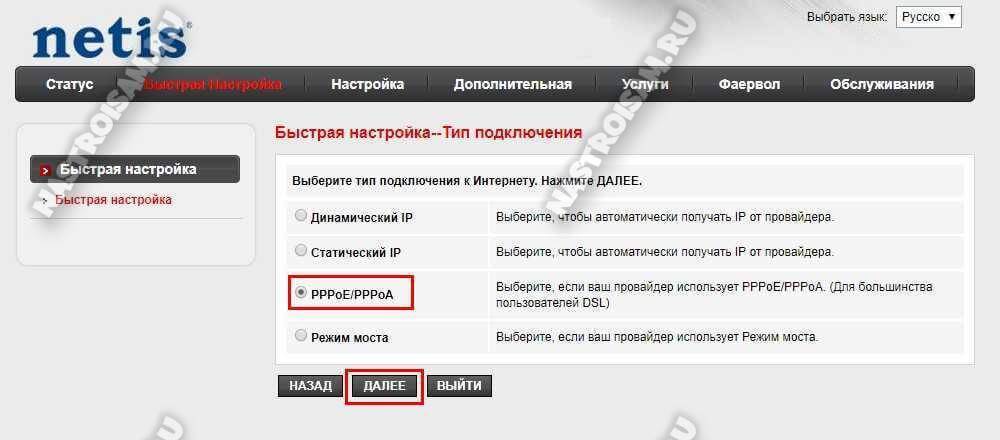Следующим шагом идёт выбор типа подключения к Интернету. Как правило, в России используется или Динамический IP, или протокол PPPoE.