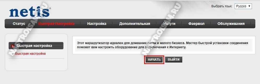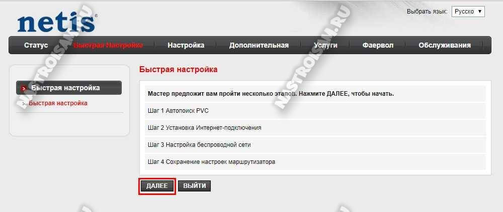 Если Вы впервые вошли в настройки модема, то после авторизации автоматически откроется страничка мастера быстрой настройки устройства. Если не запустился, то Вы всегда можете его открыть, кликнув на соответствующую кнопку в главном меню веб-интерфейса.