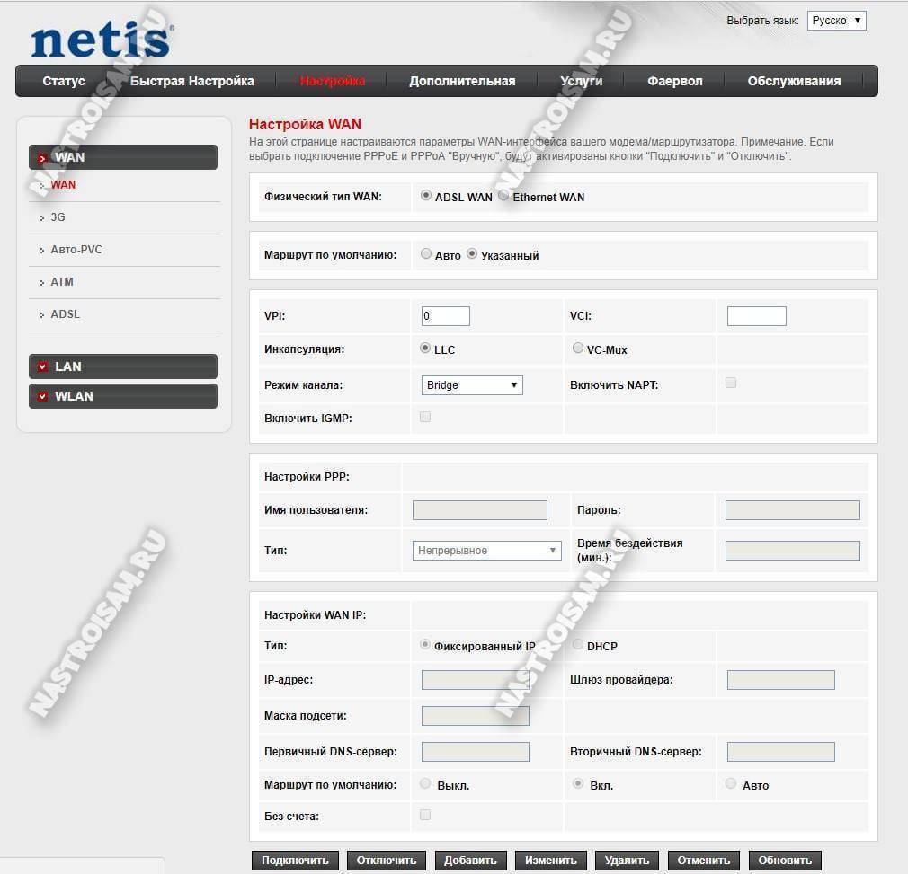 Для того, чтобы получить полный доступ ко всем параметрам устройства, выберите в меню модема netis DL4323 пункт «Настройка». Открываем подраздел «WAN»: