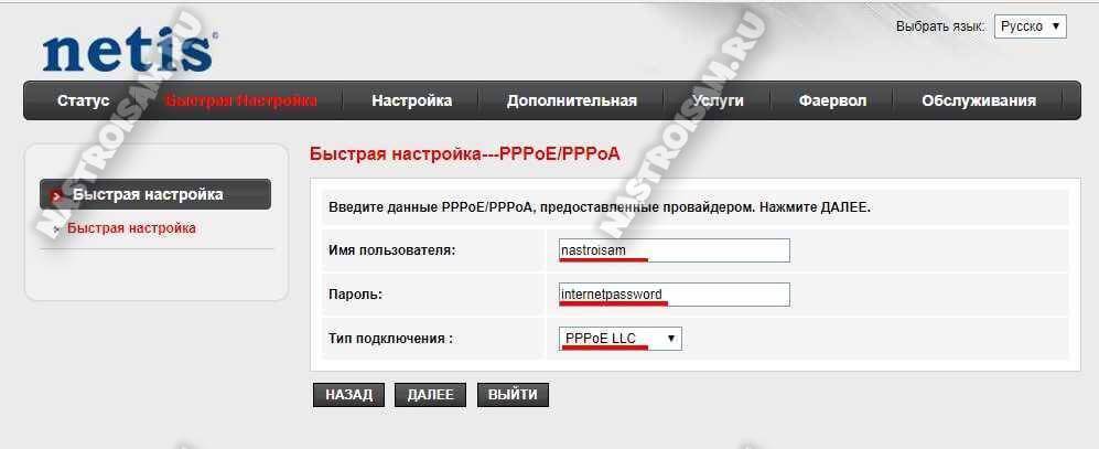 В случае с PPPoE маршрутизатор потребует ещё указать логин и пароль для подключения, которые обычно выдают вместе с договором.