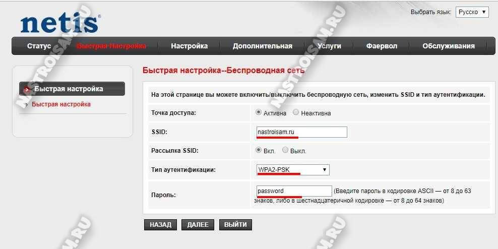 Последним шагом идёт настройка WiFi на netis DL4323. Вам нужно придумать имя для беспроводной сети и прописать его в поле «SSID».