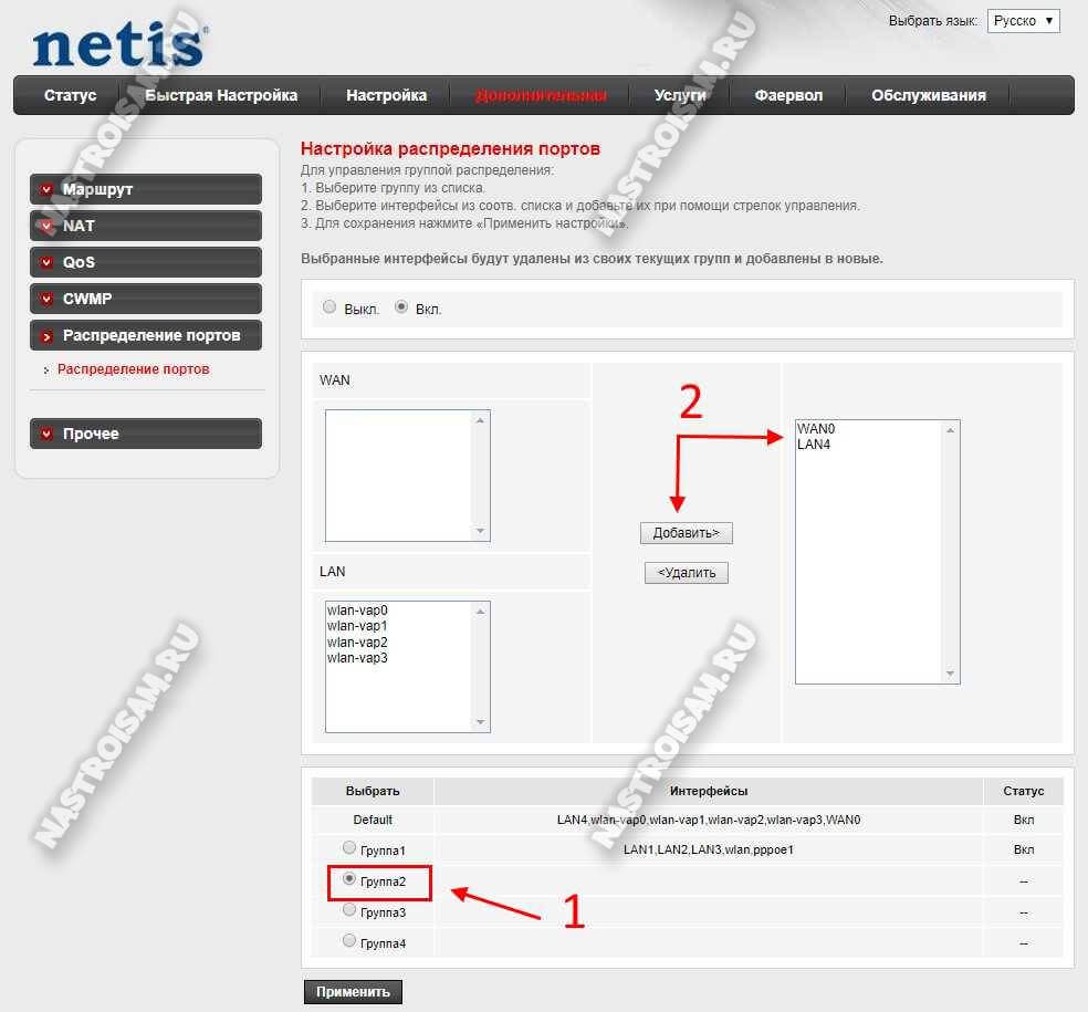 Внизу, в списке групп выбираем первую группу. Она будет отвечать за доступ в Интернет. Теперь выше, надо с помощью кнопки «Добавить» перенести все LAN-интерфейсы, кроме того, в который будет подключаться ТВ-приставка, беспроводную сеть WLAN и Интернет подключение PPPoE в поле справа так, как это сделано на скриншоте. Кликаем на кнопку «Применить».