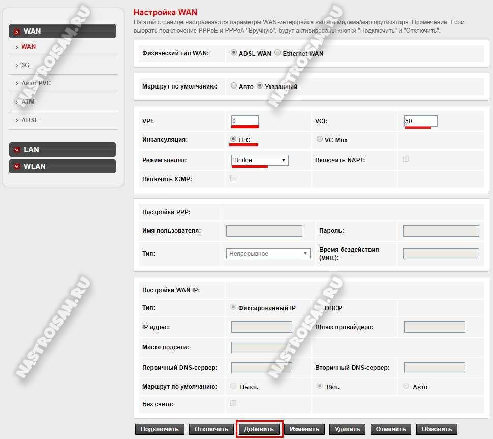 Выставляем параметры канала VPI и VCI. У Ростелекома для IPTV обычно используются значения 0/50. Инкапсуляция — LLC, режим канала — Bridge. Кликаем на кнопку «Добавить».