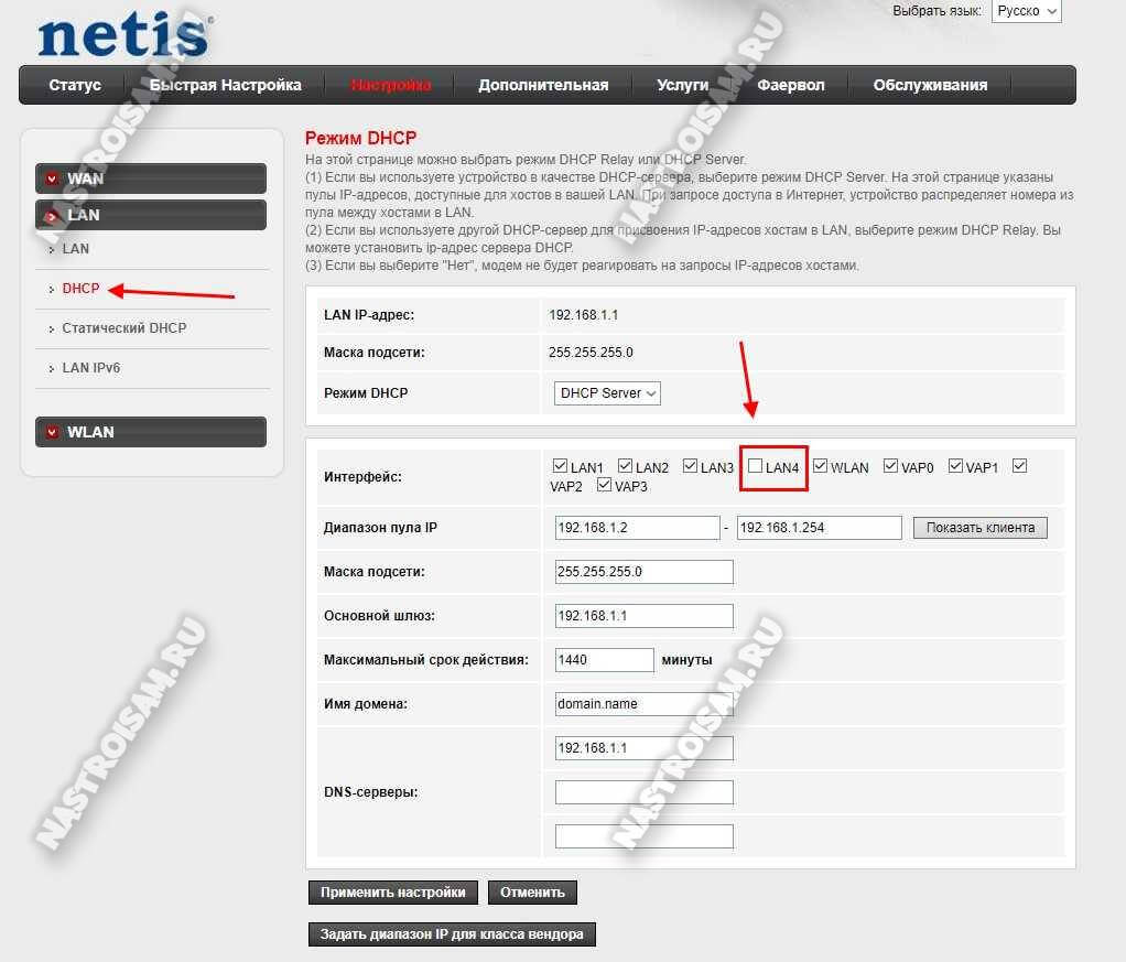 Остаётся последний штрих! Переходим в раздел «Настройка» -> «LAN» -> «DHCP»: