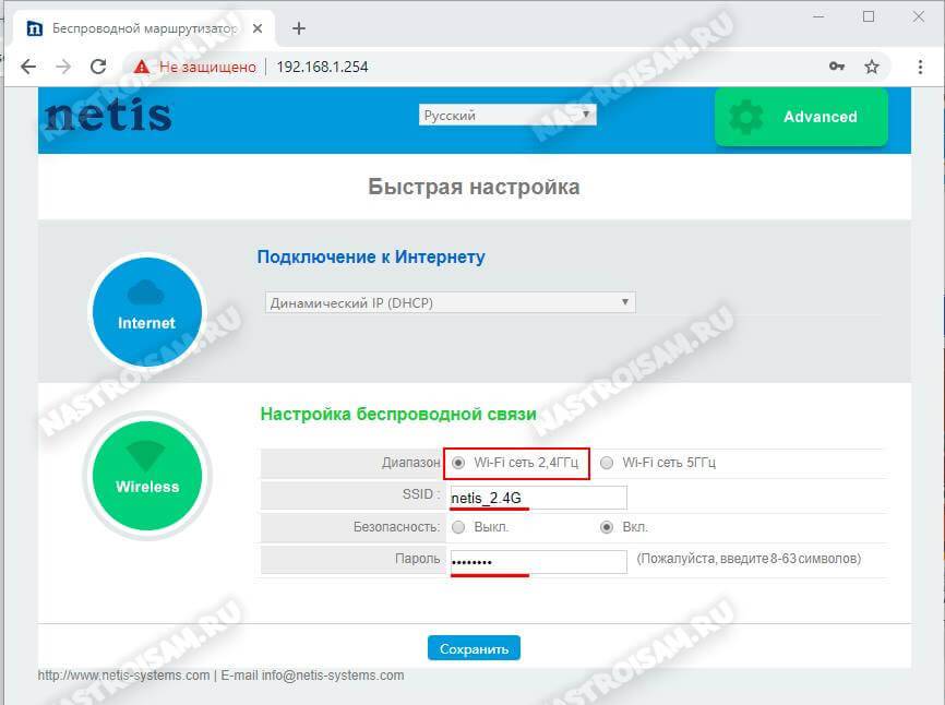 Сохраните настройки, нажав на кнопку “Сохранить”. Все будет сохранено без перезагрузки. Появится сеть с новым именем (если вы его сменили). Для подключения к которой нужно использовать установленный пароль. Интернет через Netis уже должен работать. Если не работает, значит заходим в настройки и проверяем подключение.