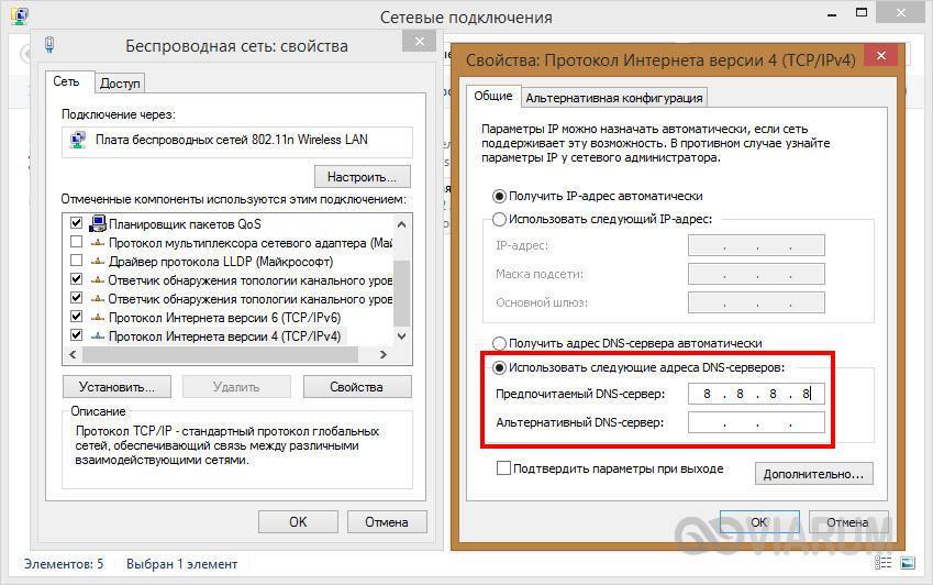 В открывшемся окне свойств установите получение IP-адреса и адреса DNS-сервера в автоматическом режиме. Если автоматика уже выставлена, попробуйте вручную установить адрес DNS 8.8.8.8 (Google) или 77.88.8.88 (Яндекс). Также можно установить адрес любого другого альтернативного DNS-сервера, найти который не составит труда в интернете.