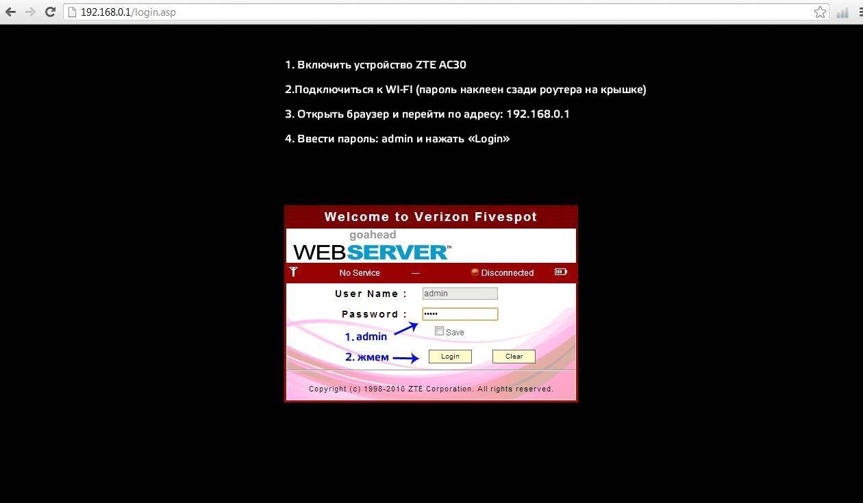 Перед вами откроется веб-интерфейс ZTE AC30, для того чтобы в него попасть введите логин и пароль. По умолчанию: login: admin и parol: admin