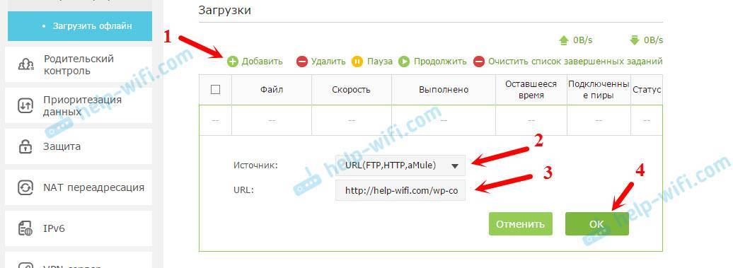 Добавляем ссылку на файл или .torrent для загрузки. Управление офлайн загрузками