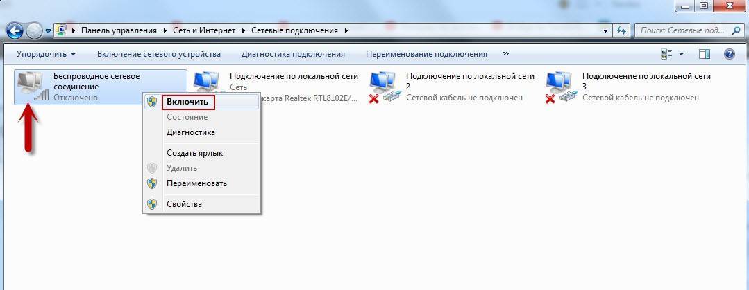 В следующем меню подсвечиваем ссылку «Беспроводное сетевое соединение». В нерабочем положении модуль имеет нейтральный окрас. Воспользуемся ПКМ, жмём запрос «Включить».
