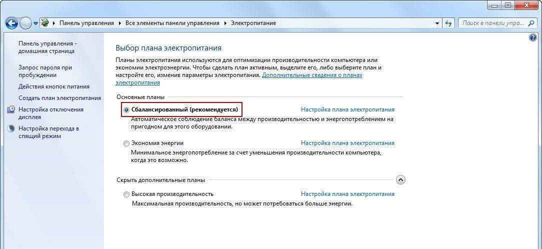 Если включена опция «Экономия энергии», отменяем её. Переключаем ноутбук на рекомендуемый «Сбалансированный» режим.