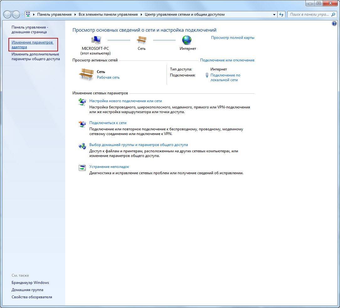 В левой части окна задействуем команду «Изменение параметров адаптера».