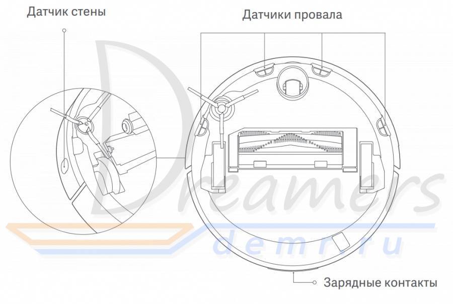 Среди основных: датчик столкновения, высоты, пыли, давления, определения типа обрабатываемой поверхности.