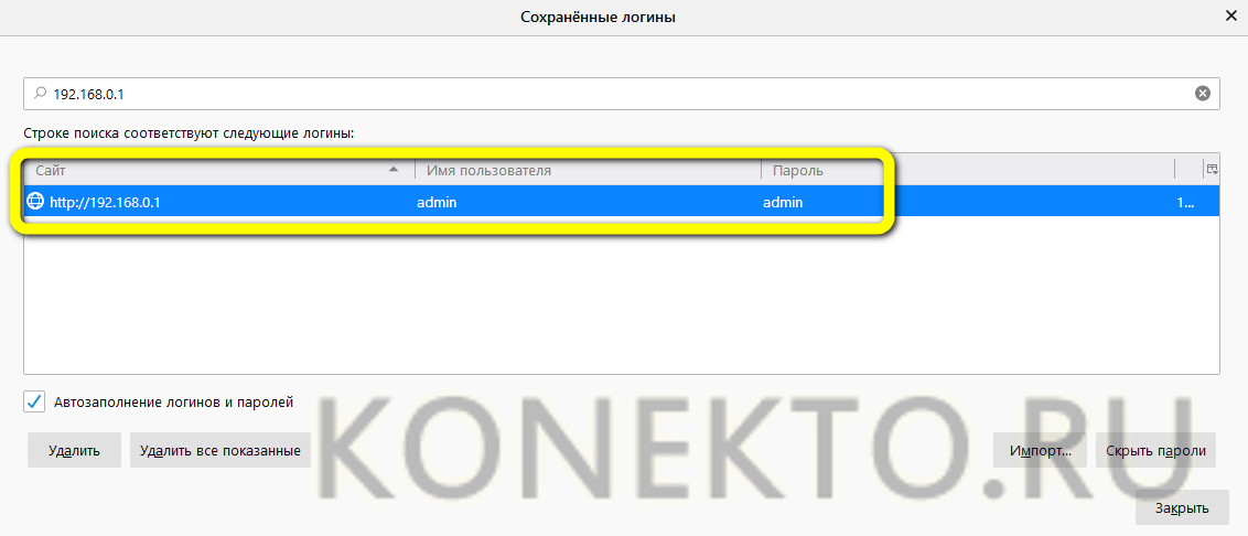 Есть надежда найти логин и пароль администратора и в сохранённых данных браузера — а чтобы упростить себе задачу, пользователь, который всё ещё не может зайти в «Настройки» роутера, должен задать фильтрацию по IP-адресу: 192.168.1.1, 192.168.0.1 или любому другому, используемому прибором.