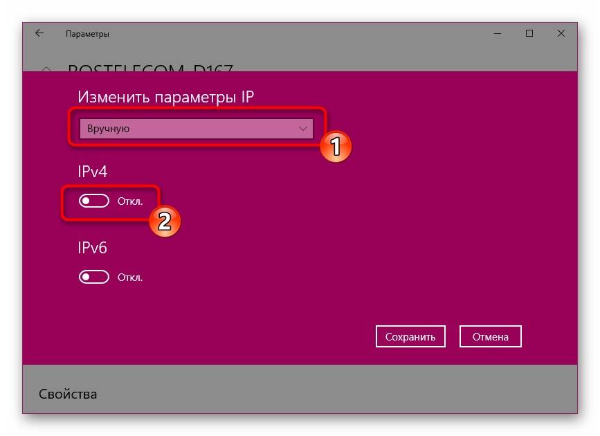 - При установленных ручных значениях изменить их на автоматические и сохранить изменения. Если автоматические параметры уже установлены, то их следует изменить на статические, указав режим «Вручную» и выделив пункт «IPv4».